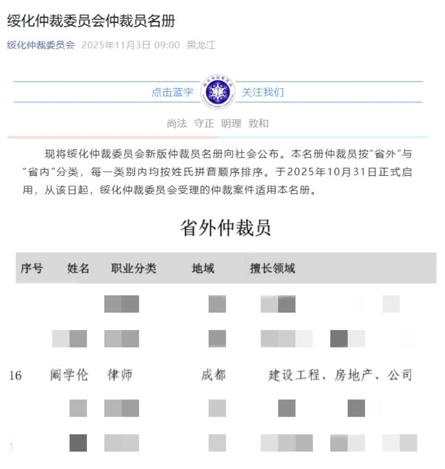 2025年11月3日,第二届绥化仲裁委员会仲裁员聘任名单正式公布,四川律大律师事务所阚学伦主任凭借自身专业领域的深厚积淀与仲裁实务经验,成功续聘为该届仲裁委员会仲裁员。