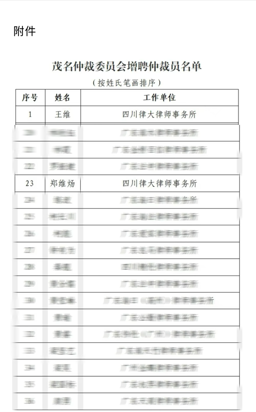 我所王维律师、郑维炀律师获聘担任茂名仲裁......